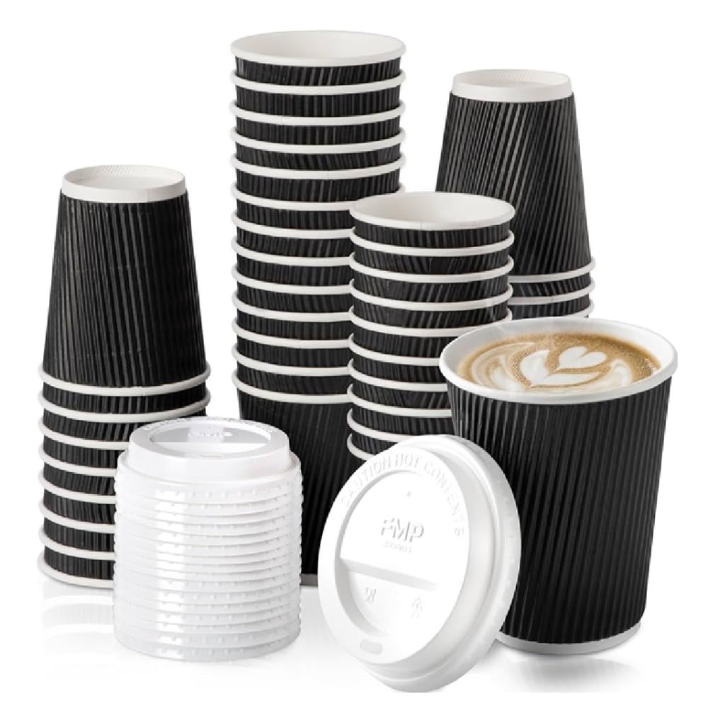 Two Layers Black Paper Cups With Cover Heat Resistant 12 oz ( Set 25 Pcs )